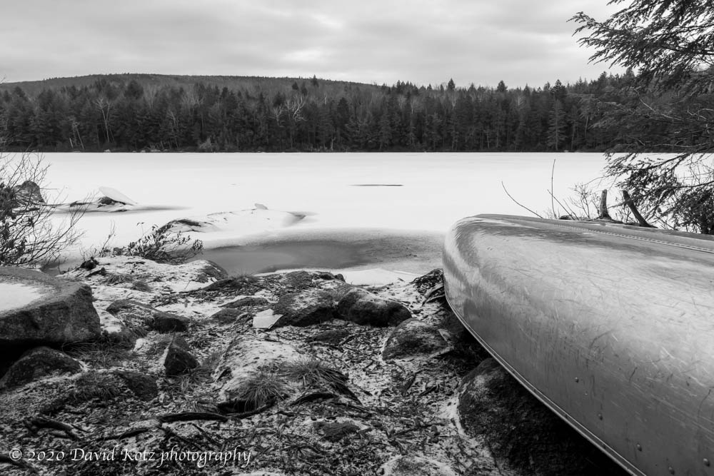 Today, the woods were entirely snow-free after the Christmas rainstorm, but there was a fresh dusting of powder along the exposed rocks and coating the skim of ice across the pond. A canoe and paddles, apparently left for anyone who wishes, rest on the shore where trail meets pond.