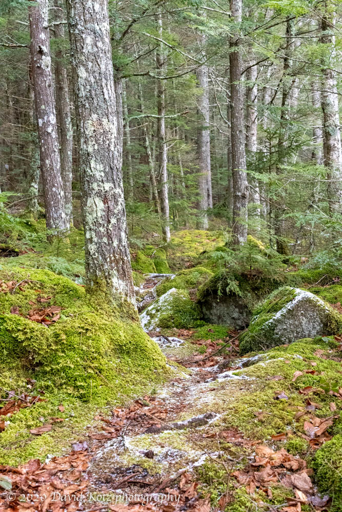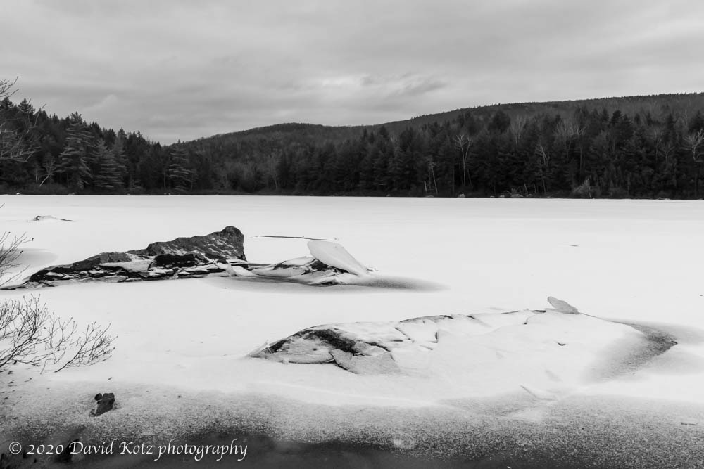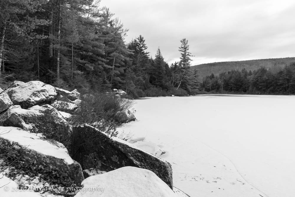I know little about black & white photography but decided to process these snaps of the pond in black & white because, well, this presentation seemed to fit the monochrome pond, gray sky, and dark forest. In contrast, here’s a photo of the trail along the shoreline: