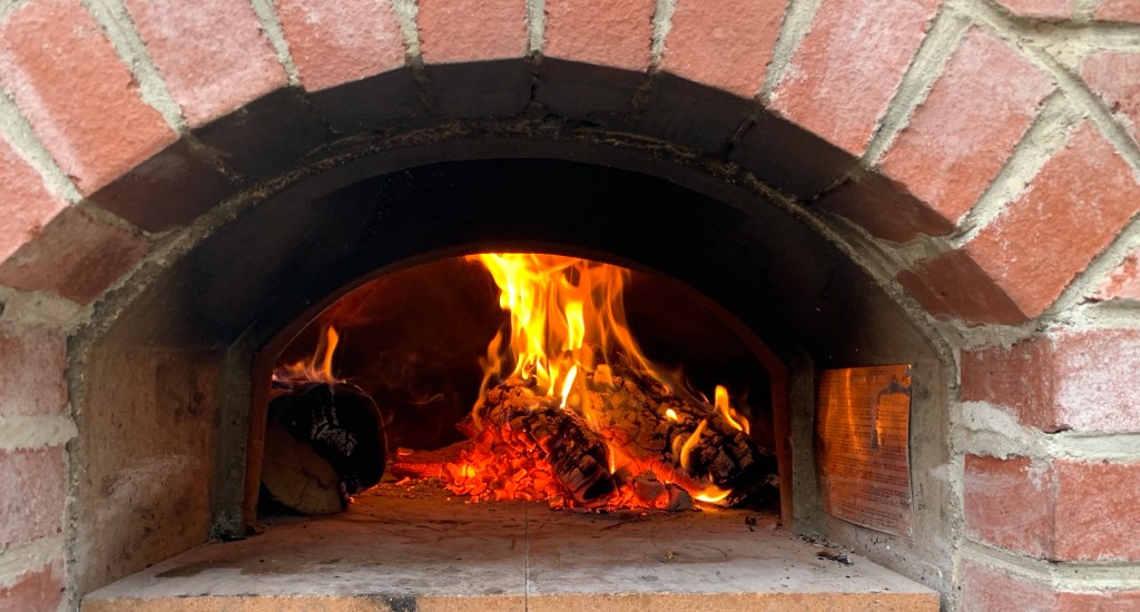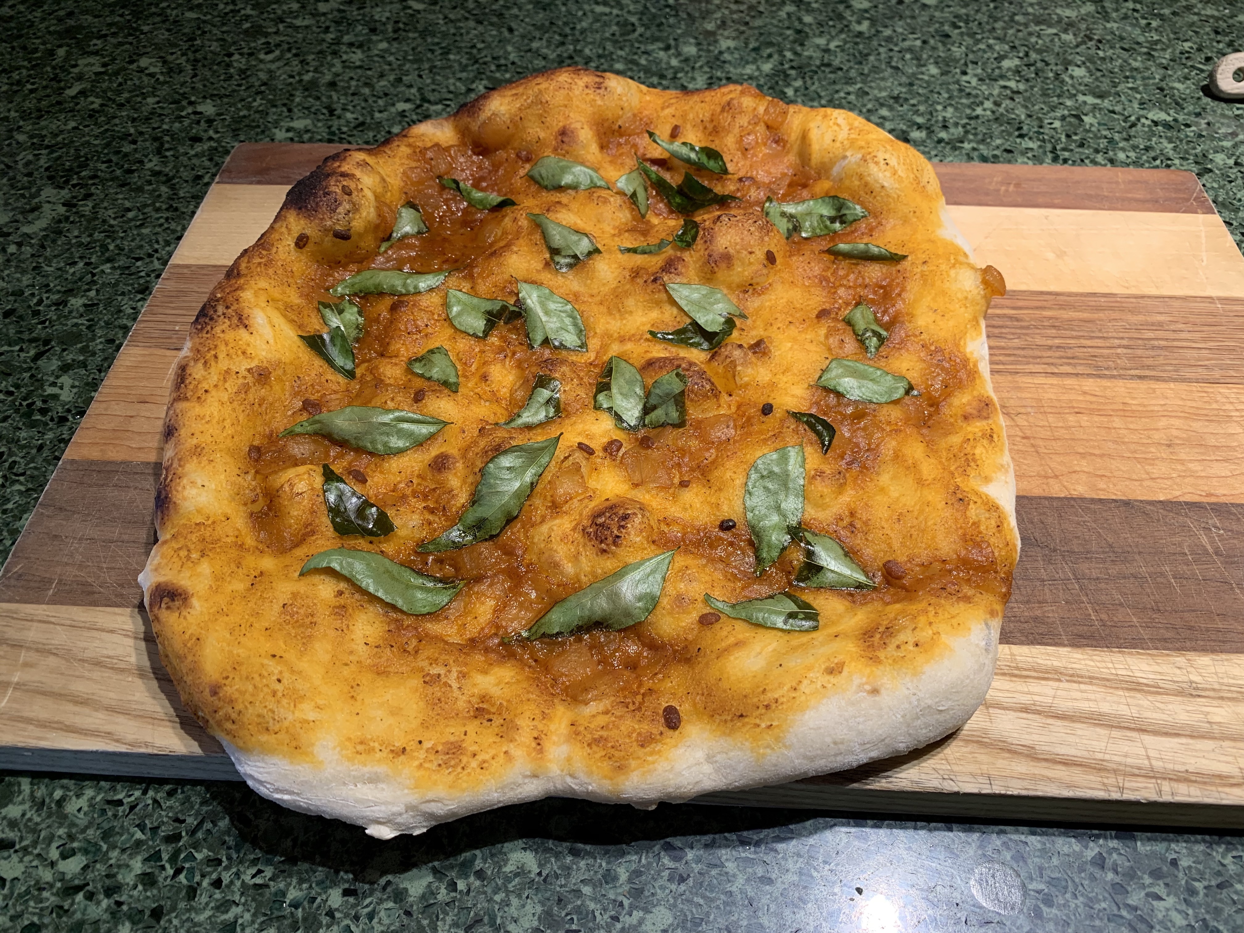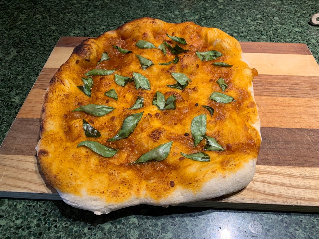 One nice thing about a having a pizza oven at home is that you make a lot more pizza… and start experimenting. We are also lucky to have a curry-leaf plant at home; its pungent leaves are commonly used in South Indian cooking. So I made a simple pizza by spreading a thin layer of curry sauce (admittedly, from a jar) and sprinkling on some fresh curry leaves. Yum!
