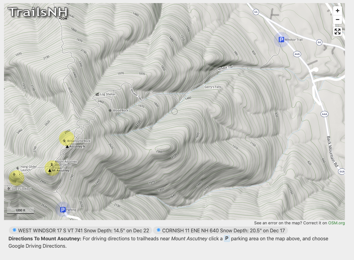 The Windsor Trail begins at Parking in the upper right and ends at the summit (the middle yellow peak).