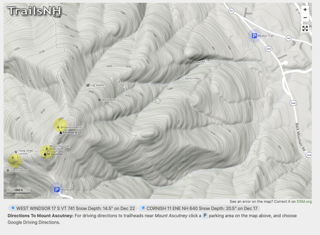 Although we were interested in a return to Moosilauke, the favorite, the forecast showed morning sun with increasing clouds and I feared we’d simply climb into the clouds. So I selected Ascutney; it has lower elevation but 360-degree long-distance views. And heck, it’s been more than four years since I was last there in winter.