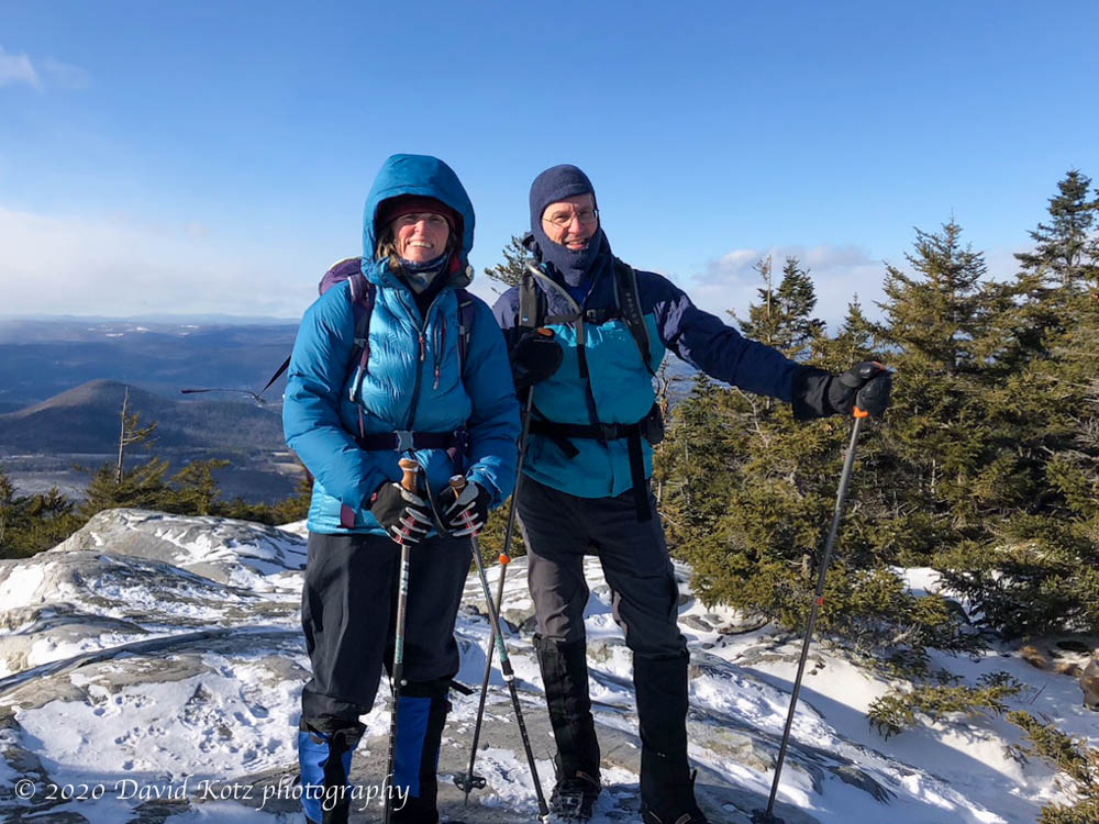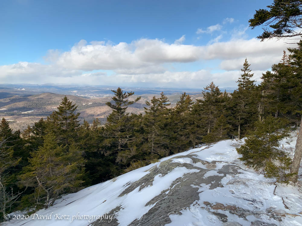 From here the trail was very icy through the woods, and we were grateful for the microspikes. On the final hundred meters, though, the trail scrambles up a series of granite ledges to the summit; on bare rock the microspikes are actually more slippery than boots, but it was inconvenient to take them off.
