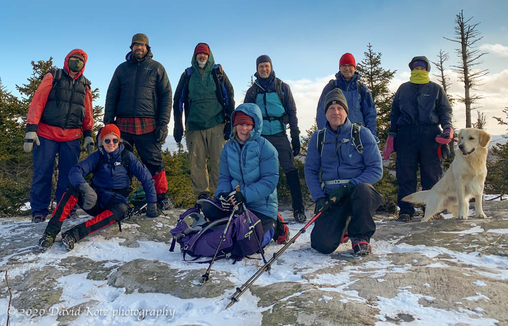 The summit of Cube has grand views to the west, and sometimes offers a glimpse of Moosilauke through the trees to the northeast. Today, however, Moosilauke had clouded in. One could imagine the fierce conditions up there today, in these strong winds. Much better here on Cube! We gathered for a group photo and a quick snack before sliding carefully back down the trail to the car.