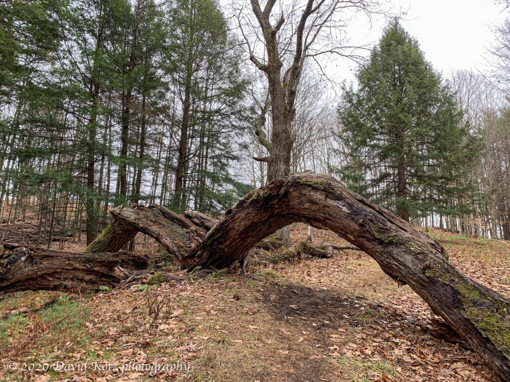 A huge fallen oak branch forms an arch over the Hemlock Trail on Balch Hill.
