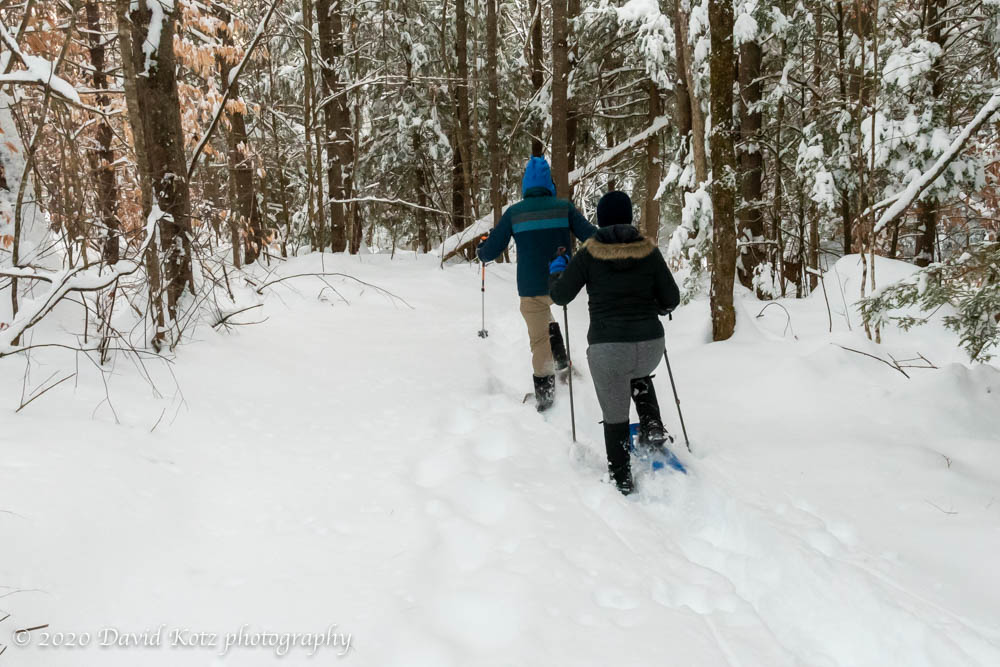 Andy and Mara snowshoe on the trail around Crossroads in Lyme.