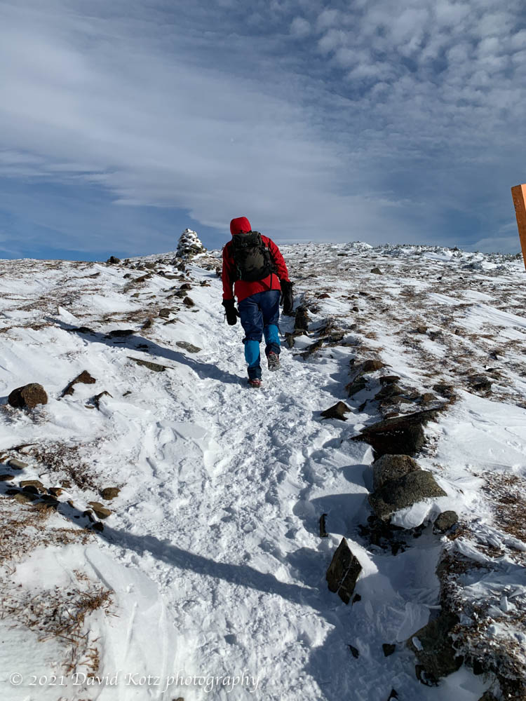The sky had shifted from gray to blue, as we climbed above the valley clouds. Traversing the ridge to the main summit, we could see an undercast to the west and clear valleys to the east; Moosilauke was surely the cloud-splitter today. The wind was strong, we could tell. Once we left the trees and began to climb the summit cone, a blustery north wind kept us staggering. Despite the wind, temps were in the 20s so the windchill wasn’t too bad.