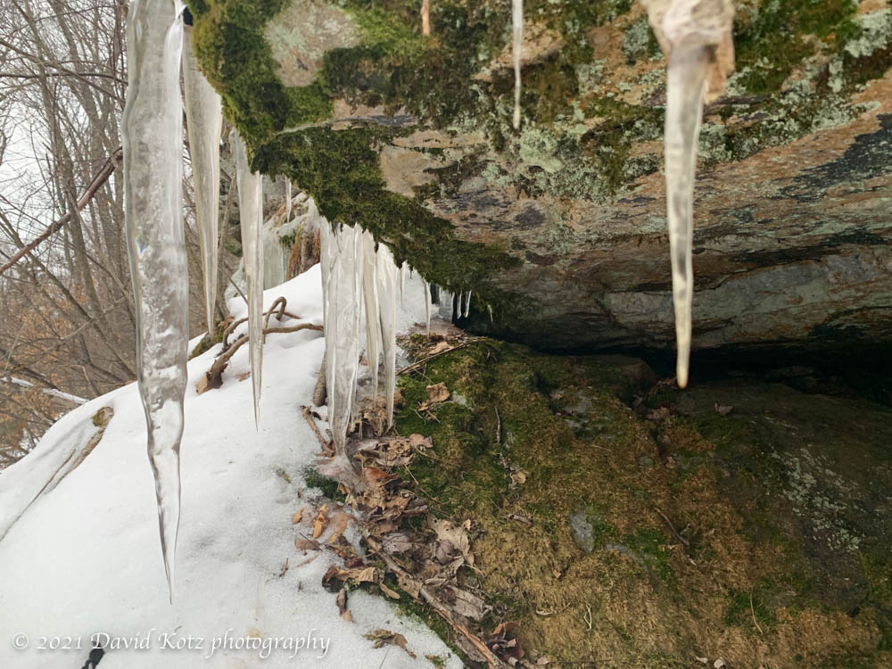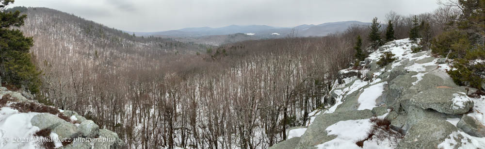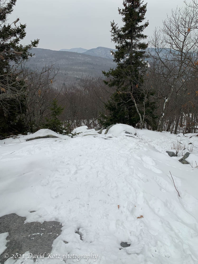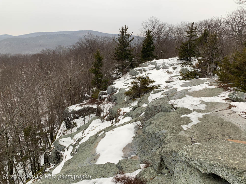 Two years later (fall of 1985, I believe) I returned to these ledges by sawing my way from the base to the ledges with a chainsaw, quite literally, as part of a DOC work group. On a brisk fall day we slowly cleared a new trail. I think of that day, and the many friends on that crew, every time I climb the steep slopes among the rocky outcroppings. Today, it was gratifying, even as I strode alone up through a light snow-cover and under gray skies, to think about the many thousands of thru-hikers and day-hikers who have enjoyed this trail in the 25 years since that fall. Today, I was the only one on the trail, though the were plenty of tracks from hikers who have visited since last week’s snowfall.