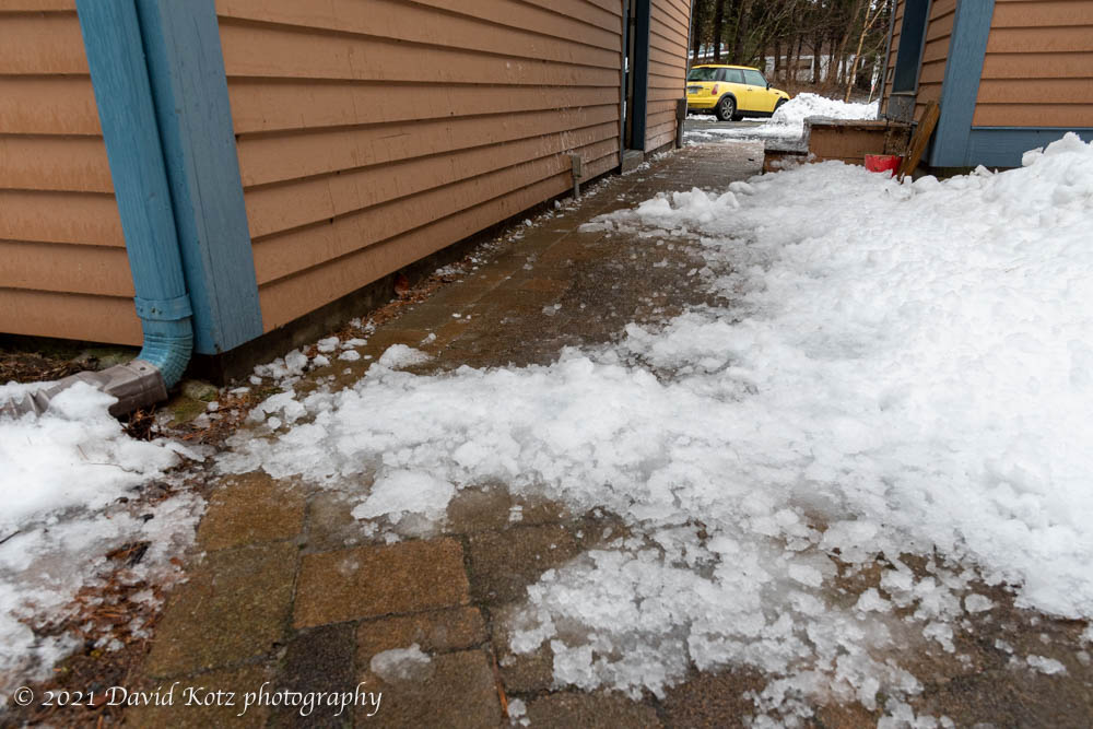 On the other side of the house, however, we have a walkway between the house and the garage; when those roofs let go of their snow, we end up with a densely-packed mass of snow on this walk and our entryway. Today it’s a minor irritation, because there is little snow left to fall off the roof.