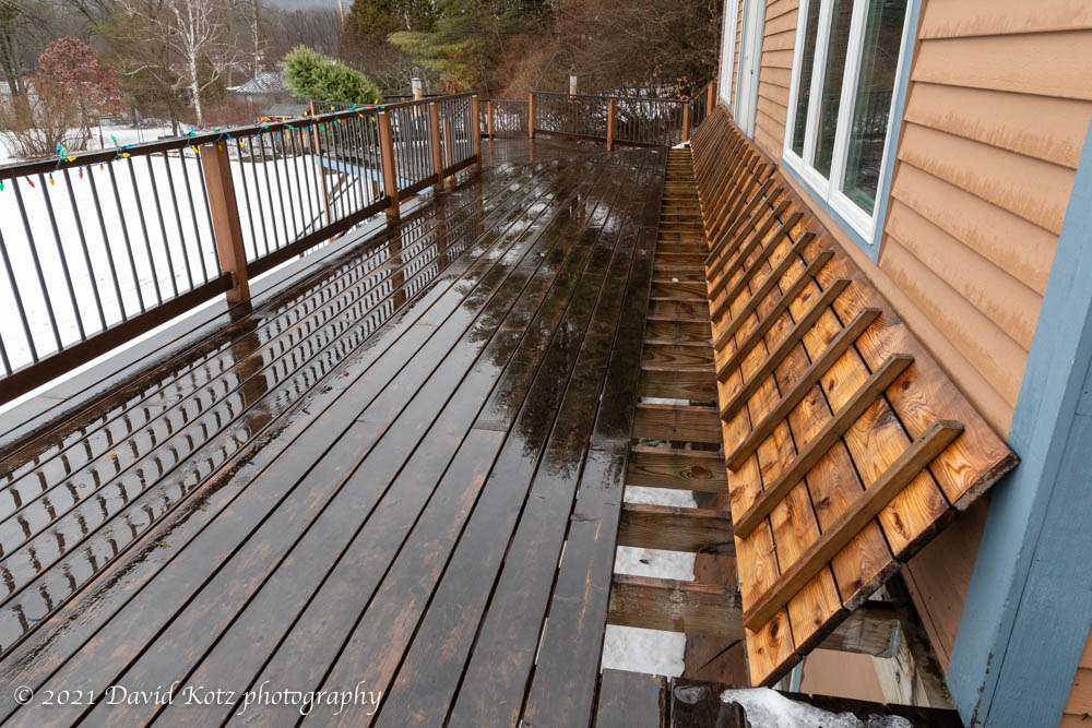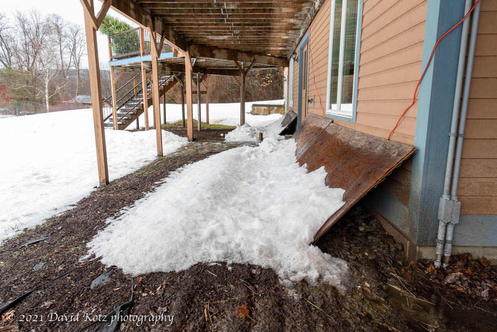 Great solution! On the other hand, it passes the buck to the floor below, so we set up plywood ‘deflector shields’ to angle the snow away from the siding and foundation.