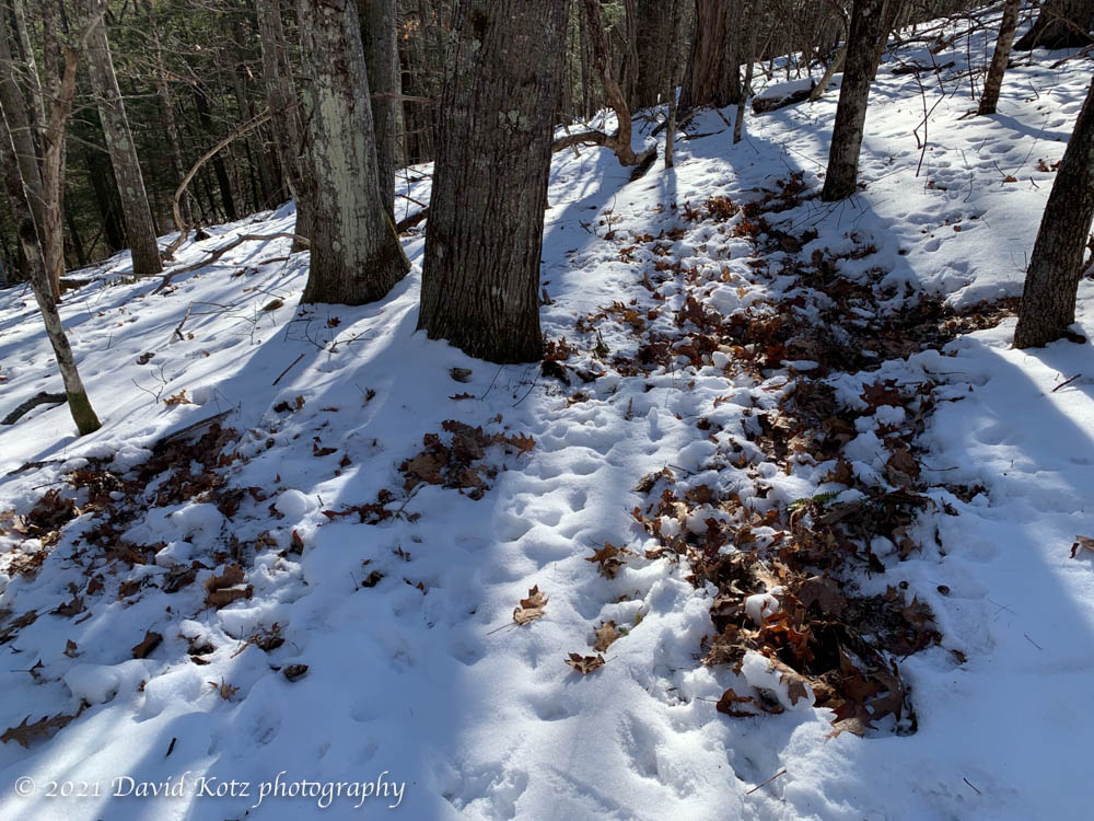 This is an area I often see littered with deer tracks, and large areas where they’ve scratched through the snow and leaf litter in search of any acorns left over from the fall, as you see above.