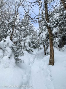 Soon after the trail broke into the open, with some views of the valley as the trail crossed what (in summer) must be granite ledges intermixed with the hardy spruce, two snowshoe trails diverged: one right, and one left. His earlier information saved me tremendous time, here, as I turned left and avoided the false trail to the right. (He said he’d followed the right-hand trail and found himself “walking on treetops” – spruce traps that can swallow a hiker whole – and backtracked to attempt to find the proper trail.) As I looked to the left, a bit of blue blaze peeked out where a rock emerged from a gap in the snow, apparently missed by the earlier groups. I pressed on to the left.