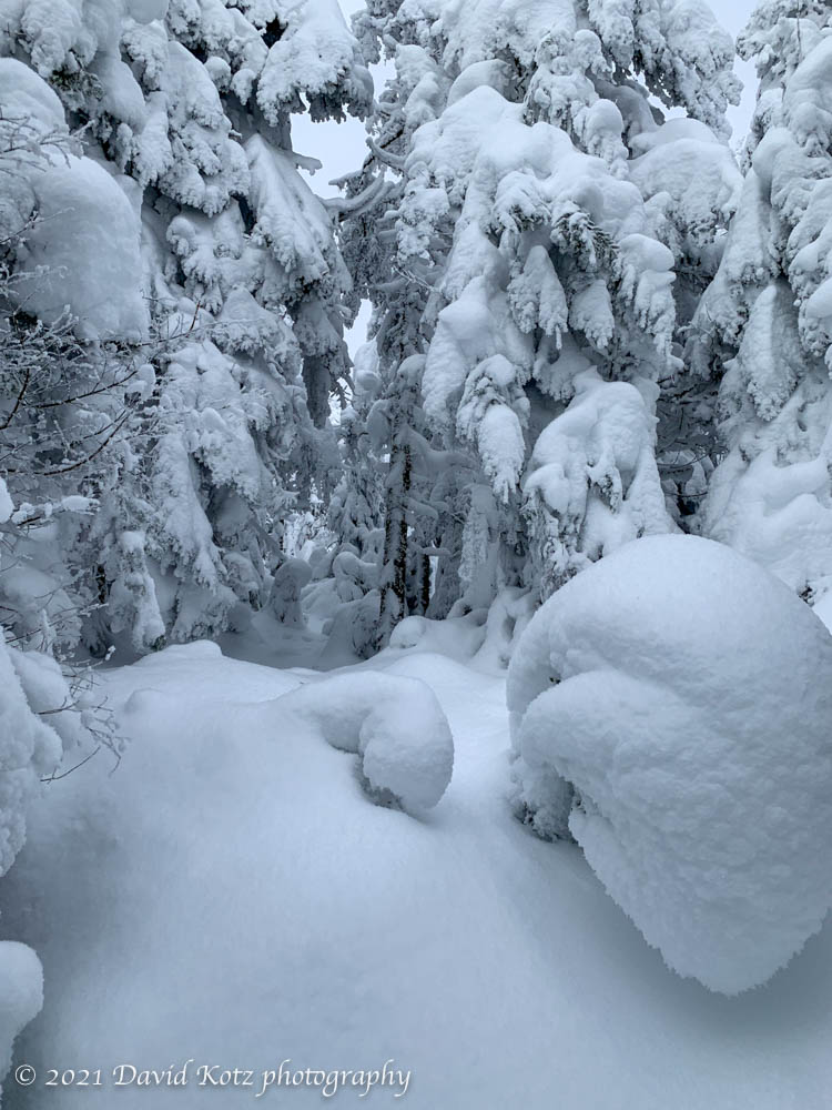 Following my nose, I worked my way through deep snow among the trees. I found a tree with a blue blaze, and then a trail sign. I was back on the trail! I soon faced a near-vertical climb through deep powder. It’s an incredibly fun experience to be in fluffy fresh powder three or four feet deep – but also incredibly challenging to climb uphill.