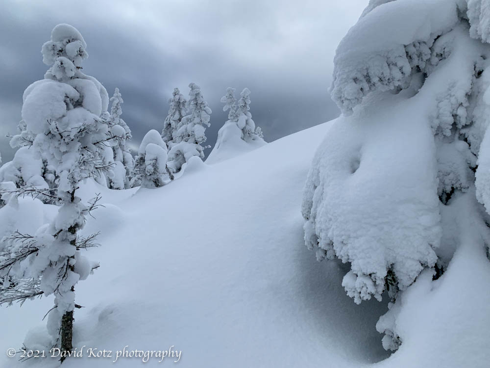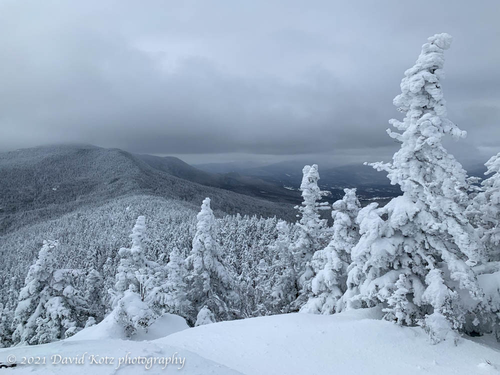 I set my ski poles horizontally across the trail above me and used them as a snow-anchor, giving me some traction to pull myself gently uphill. After another two dozen steps, I could climb no higher. Summit! Although this summit is only 3274′ (almost exactly 1000m), the views were impressive! I must say, though, I enjoyed the foreground scene of snow-covered trees more than the distant mountains under cloud cover.