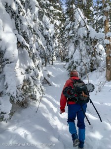 The trail was heavily packed and well traveled, so we did not need to wear the snowshoes we carried – but whenever I stepped off the trail, I sank immediately to my knees in fluffy powder. This is fun stuff!