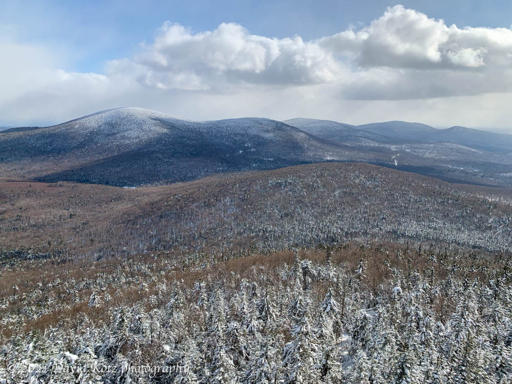 It is clearly a very popular peak, with a well-traveled trail culminating in grand views at the top of its fire tower. The fresh powder of the past few weeks was still in fine shape, and (at higher elevations) the trees were still laden with several inches of snow.