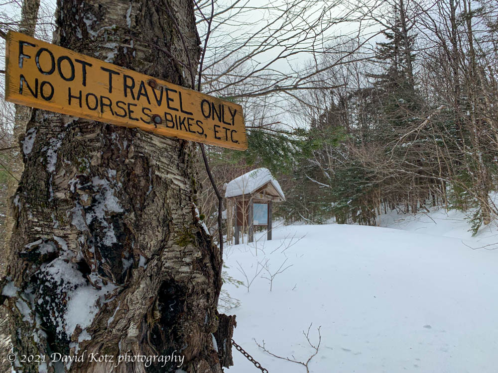 I made good time up the plowed access road, which was covered in an inch of fresh unplowed powder. At the end of the road, I nodded to the slumbering Ravine Lodge and donned my snowshoes. The big question of the day was this: has anyone else hiked, snowshoed, or skied the Al Merrill Loop this winter? If the trail was unbroken, it would be hard, slow going.