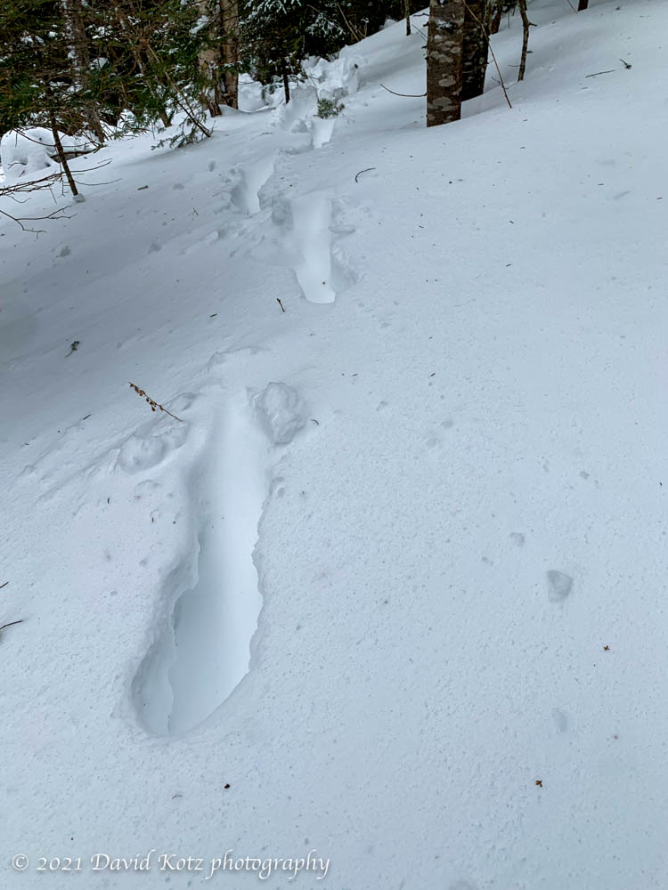 From here the trail gets a bit rougher, with one or two tricky stream crossings and a few blowdowns, but for the most part it remains a wide, sloping trail zig-zagging up the hillside. At several points, deep moose tracks cross the trail, just a day or two old.