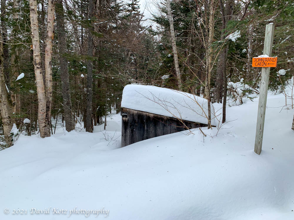 The trail was in good shape, and even the drainage ditches had intact snow bridges, making travel easy. I soon passed the side trail to John Rand Cabin, one of my favorite places to be, now sadly closed due to the pandemic. The snow on the roof of its firewood shed gives you a little sense of the snowpack here.