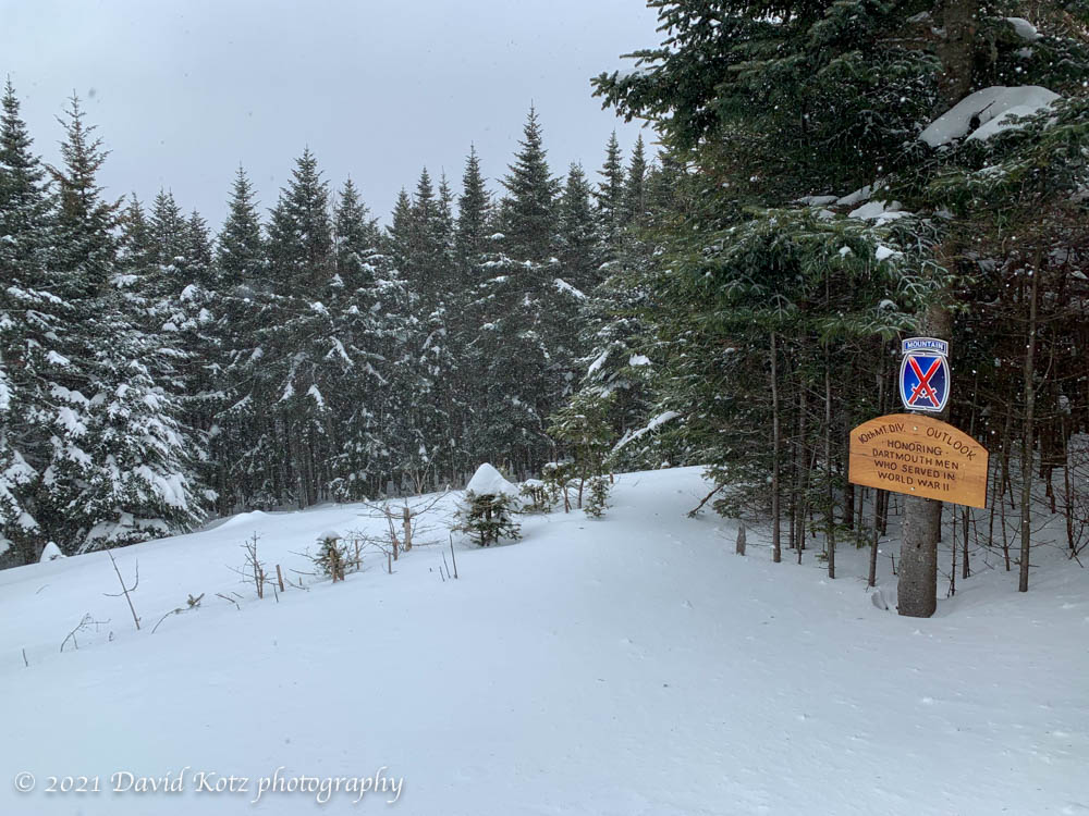 After two switches and two backs on the switchbacks, I reached the 10th Mountain Division outlook, which is nearly at the trail’s high point of 3520′. This spot often provides a nice view of Mount Moosilauke, but by now it was snowing hard and there was no view beyond the immediate clearing. Still, I enjoyed seeing the refreshed signage and thanked once again the many hardy Dartmouth men who fought in that division (and others) during WWII.