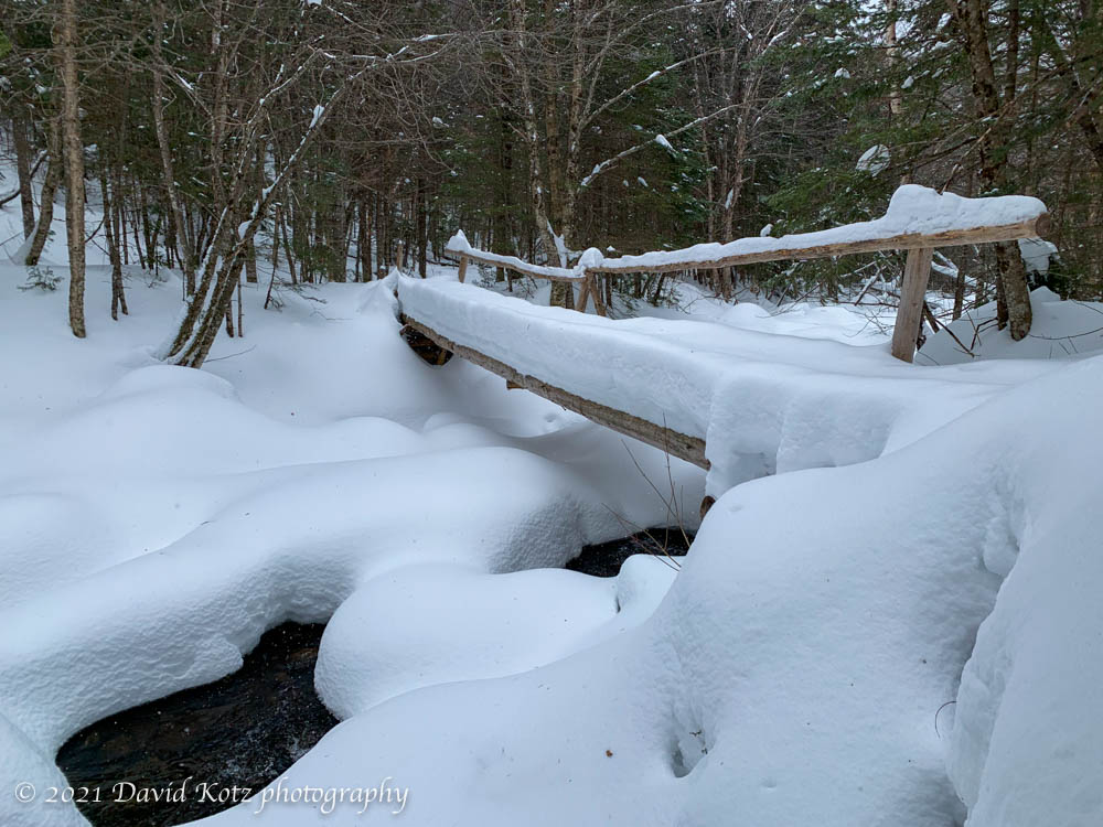 The snow was deeper here, the trees even more heavily burdened, and the wind even windier, but it was great to be headed downhill. Soon I rejoined the Ridge Trail; again there were no fresh tracks, but there were signs of older tracks. With more traffic on the Ridge Trail the going became even smoother, the underlying trail more firm. I was not the only one to realize this, as I followed day-old fox tracks for a good mile down the trail. The two bridge crossings helped to demonstrate the depth of the snow – although the snow on the bridges was far less deep than in the surrounding terrain, it remains quite deep!