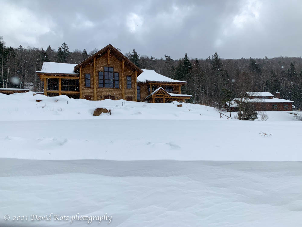 When I reconnected with my original tracks, and had nearly reached the plowed access road, I quickly diverged from my early tracks to dip below the Lodge (instead of above it) so I could get a glimpse of the Lodge and its new bunkhouses on my way out. All seems well, and I hope to see them all re-open this summer!