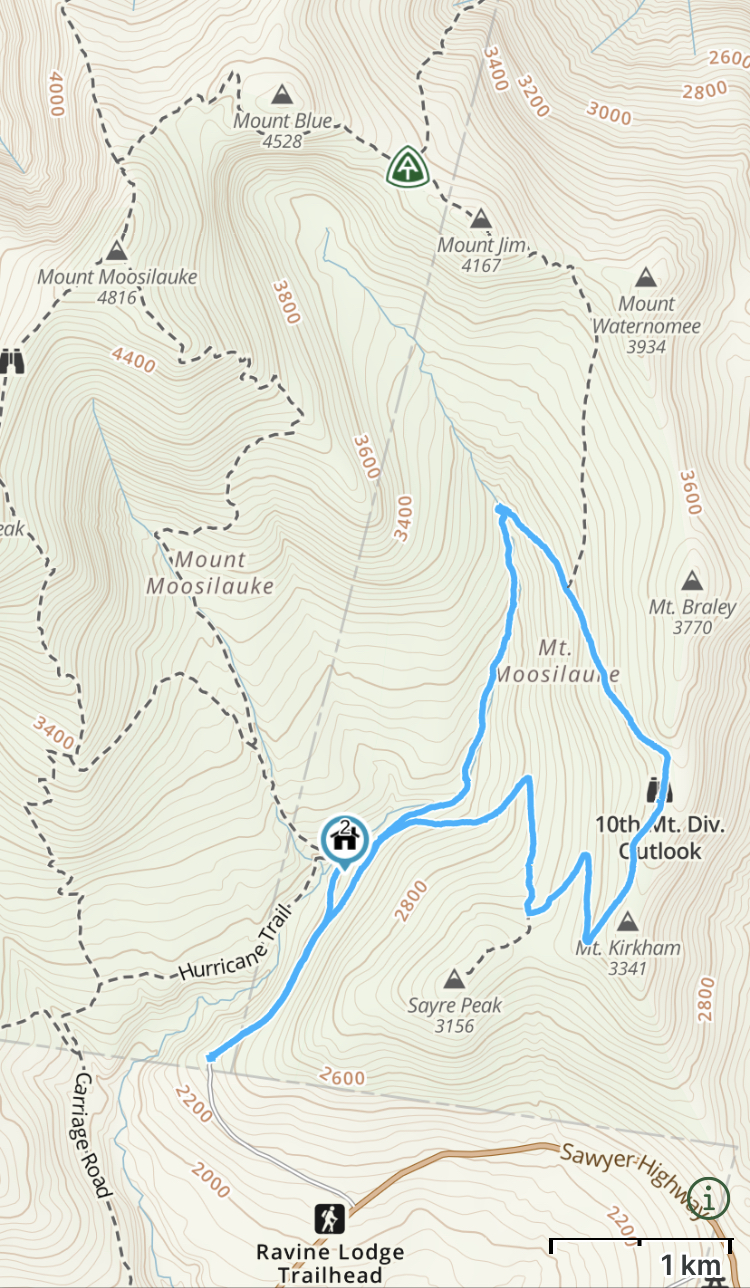Moosilauke summit is at upper left. Today’s hike is in blue, starting and ending at bottom center, and passing the Moosilauke Ravine Lodge at the icon.