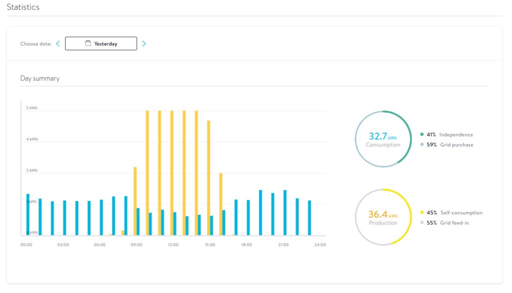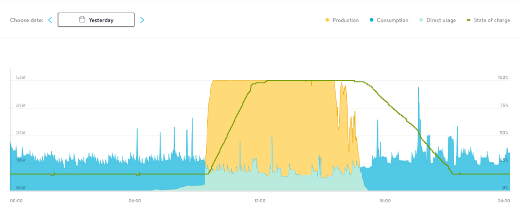 What I like about this diagram, though, is that it compares production with consumption; overall we produced more than consumed, meaning we ran the house fully off solar power and pushed excess power back into the grid for others to use. That said, we can get a more detailed view: