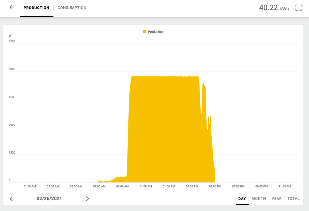 Our second full day of operation (Friday 26 February) provides an excellent example; as it happens, this day was our as-yet record-setting day of solar production, 40.22 kWh according to the Fronius inverter mounted on the tracker itself: