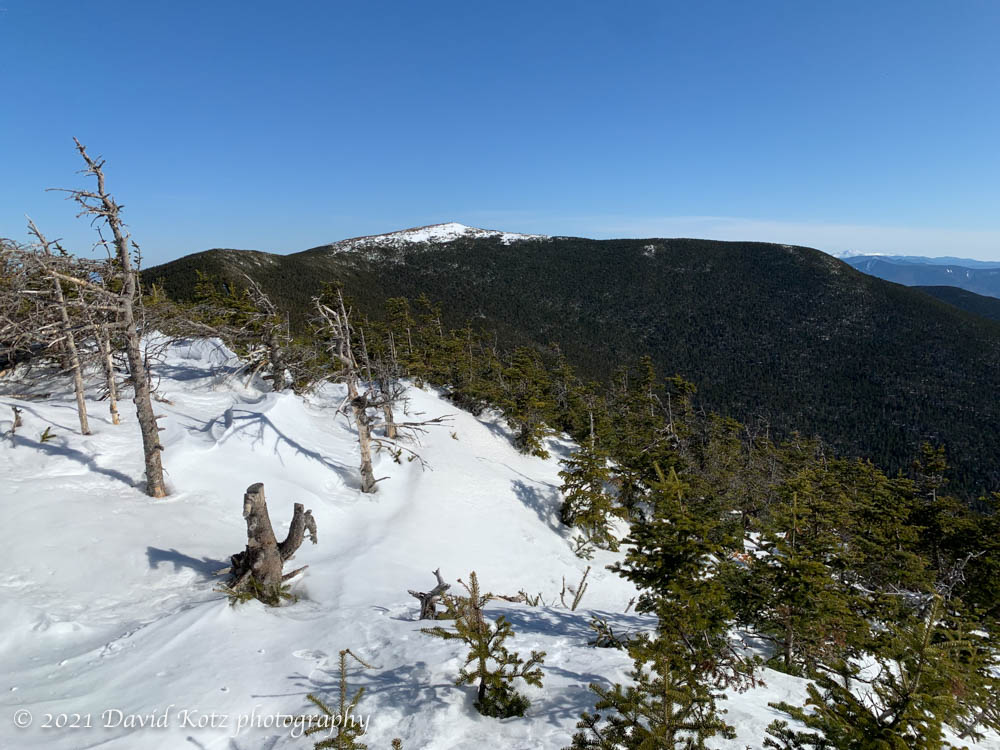 Anyway, after pausing at the summit to reflect on this poor fellow, I retraced my steps back across the ridge. Although the summit cone was nearly free of snow, swept by wind and baked in the sun, the trail across the ridge is protected by small trees and still carries about four feet of snowpack. The trailbed itself was crunchy in the morning chill, well-packed by the many boots and skis that traveled this route through the winter. I was soon back at the junction with the Carriage Road, where the skiers descend to the left and where I would descend to the right. First, though, I took a few moments to visit the nearby South Peak, for a photo looking back at the main summit.
