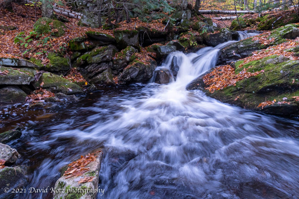 It’s becoming a pattern – a visit to Georgiana Falls two weeks ago, then Beaver Brook cascades last week, and now a return to my favorite Lyme cascades, along Grant Brook. Although I arrived perhaps a week or two late for the best foliage, the falls were still spectacular. A heavy rain yesterday brought the stream up to full force, and the surrounding forest still had plenty of yellow and orange to lend color to the scene.