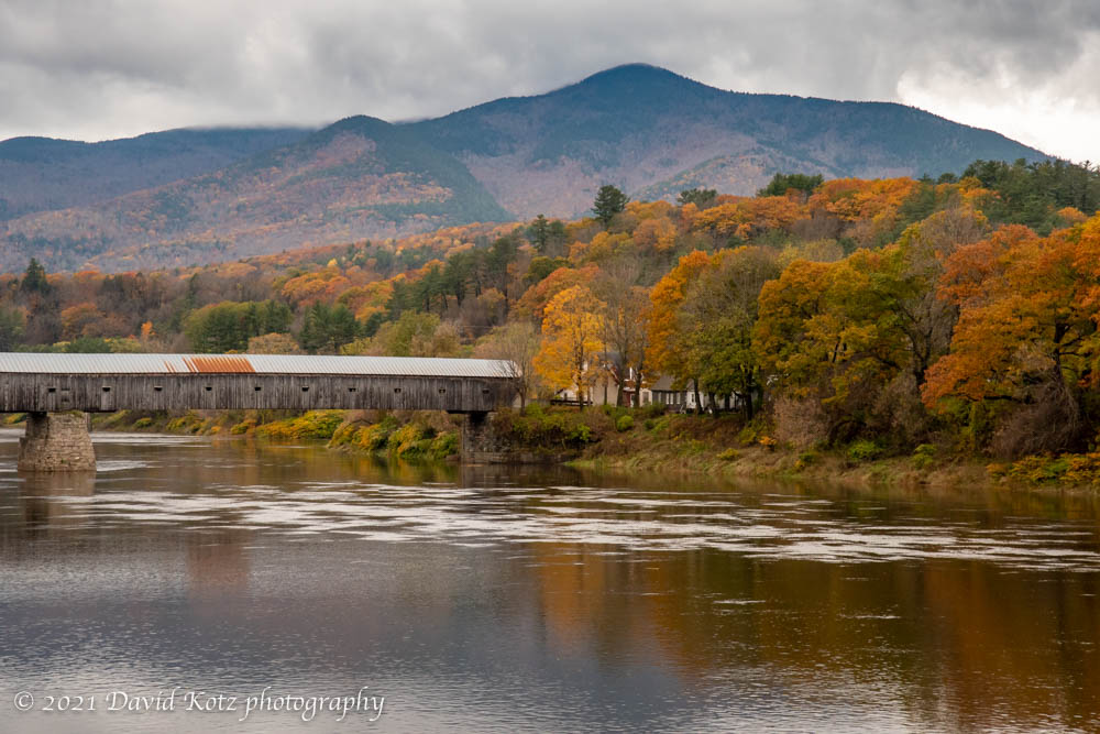 October has ended but the fall foliage is still brilliant – at least in certain pockets of our valley, and in valleys further to the south. On Sunday October 31, after photographing Dummerston Falls in southern Vermont, there were spectacular colors along the hillsides lining the interstate highway heading northward. So in Windsor I pulled off the highway to cross the Connecticut River on the iconic Cornish-Windsor covered bridge (the longest wooden covered bridge in North America, dating back to 1866), where I knew there was an opportunity for a view of the river, the bridge, and Mount Ascutney beyond.