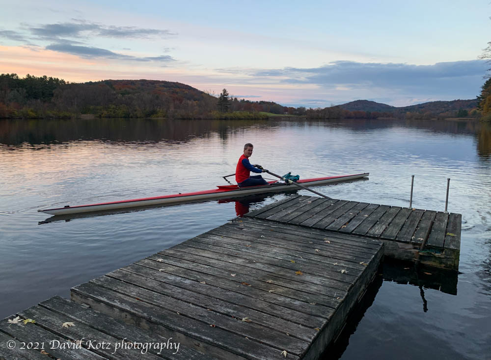 The cold and darkness of late autumn has made it increasingly difficult to get out sculling on the river. With the end of Daylight Savings Time in a few days, I will regain the morning daylight but mornings are now too cold to row – my lower limit is 40ºF. Afternoon rowing has been feasible for the past week, but will surely be impossible (with my work schedule) next week. So today I bid farewell to the river, recalling the Great Blue Heron I saw browsing the reeds a few days ago, and the ducks I saw heading south this evening. Even the hunters have shifted inland, with duck season ending and deer season opening in a few days. Now my attention turns to winter – and six months later, back to the river.