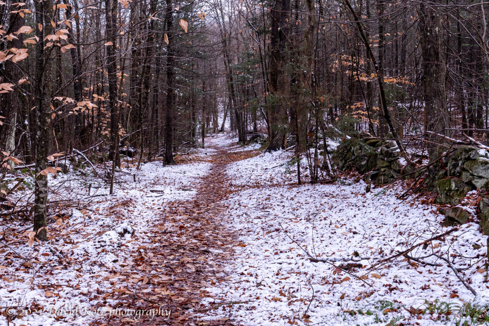 First snow along the trails of the Shumway Forest in eastern Hanover, with views to Moose, Smarts, and Moosilauke.