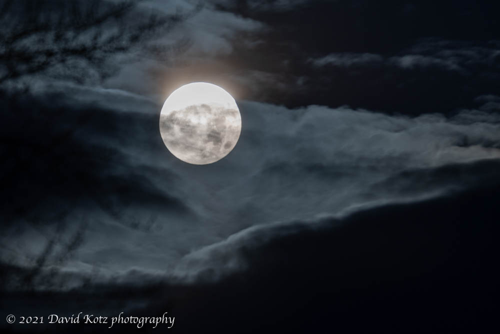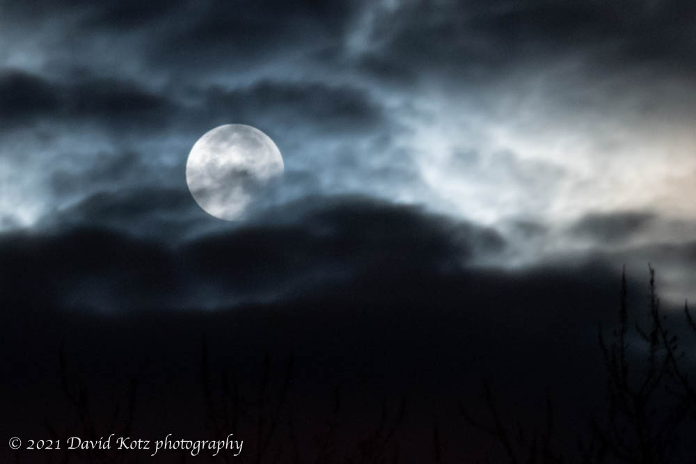 The moon disappeared behind more clouds and the branches of a leafless tree. When it reemerged, and I had relocated outdoors, the beaver moon shone again in its full glory. Exposure was tricky, and I never got it right before the moon set behind its final cloud bedding for the night.