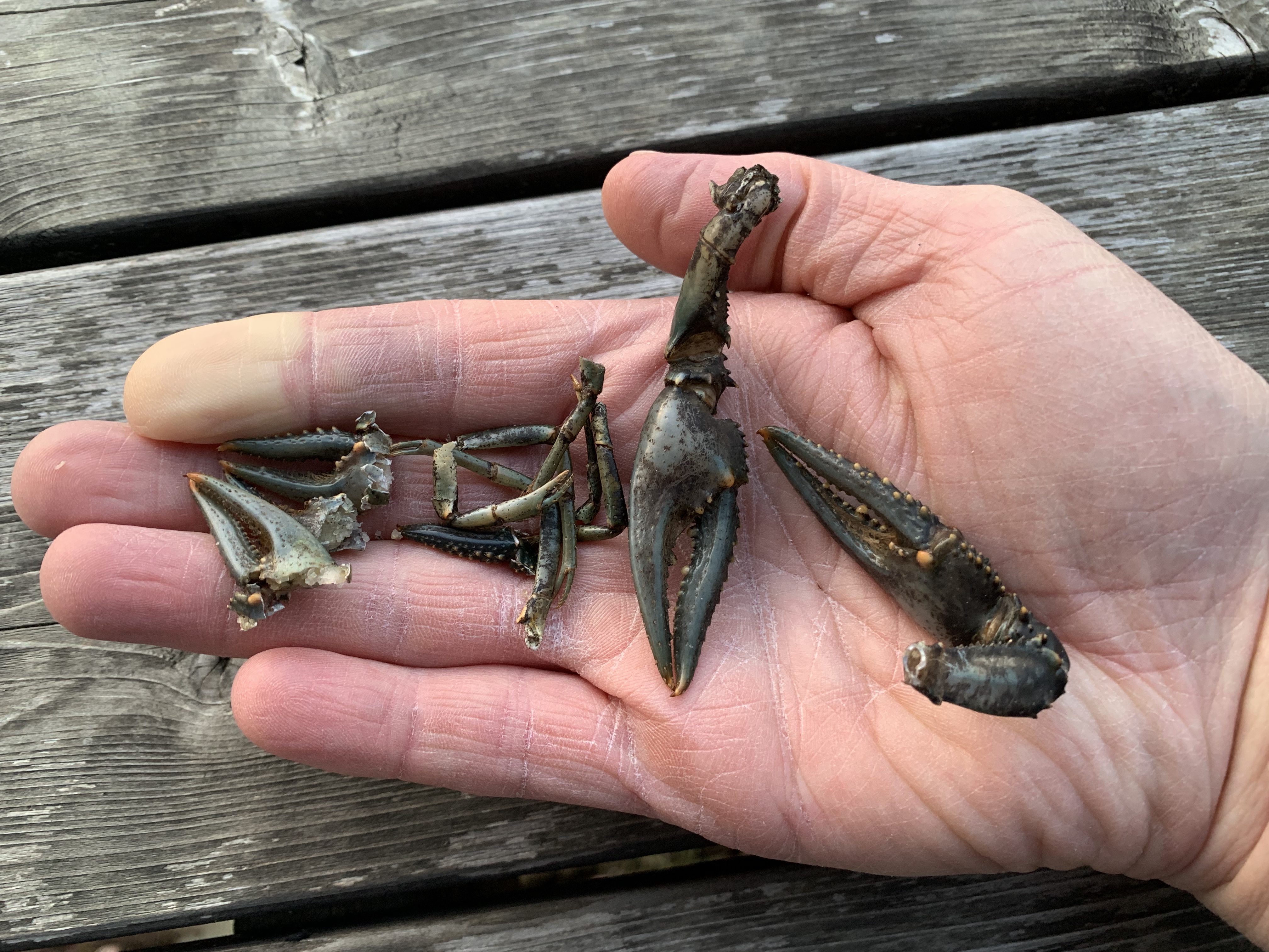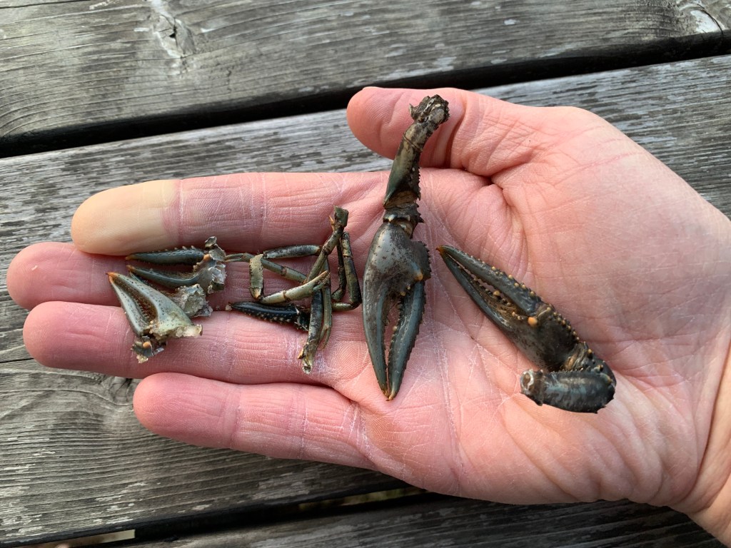 Once again – just like last fall – someone has been eating crayfish on our dock. Most likely the mink we saw here over the winter, or perhaps the otter I saw munching crustaceans this summer. I found parts of two or three crayfish this week alone!