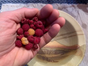 Today I enjoyed the last fresh raspberries from our berry patch – incredibly, due to the unusually warm fall weather, we’ve been harvesting berries right into November. And, despite eating a handful of berries with my breakfast every day, we’ve put away ten pounds of raspberries in the freezer. I look forward to enjoying them all winter!