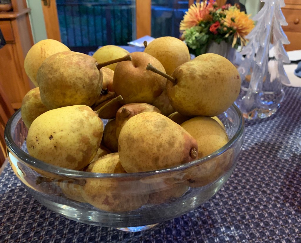 They’re quite tasty. Soon they will all be ripe. Time to make pear compote, pear crisp, pear sauce, and more…