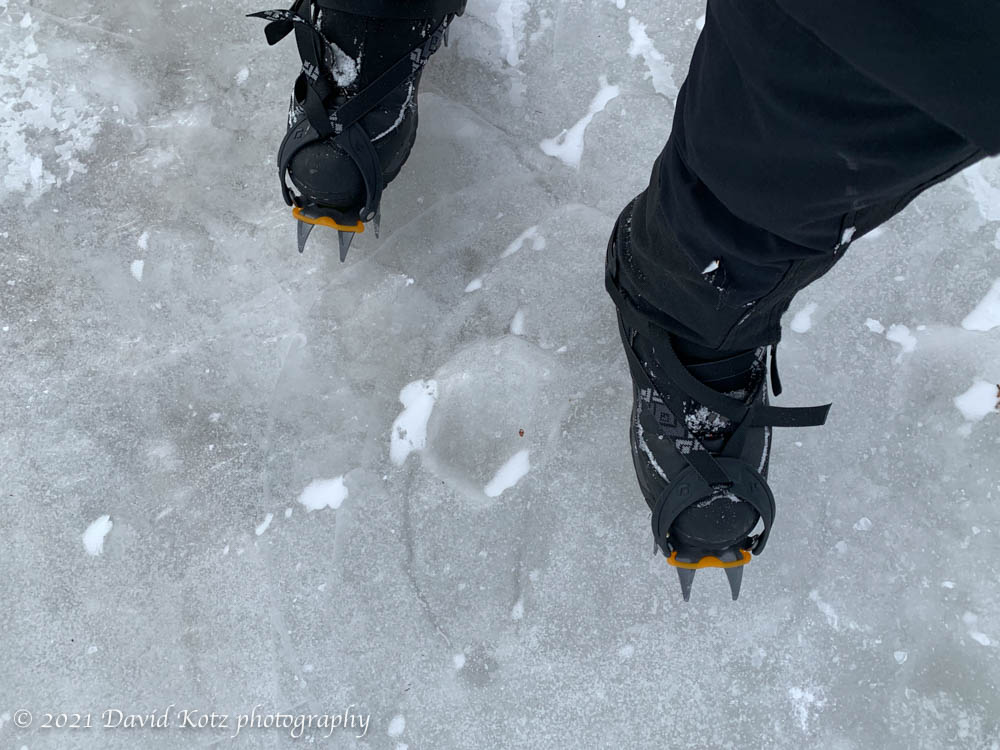 This cold weather followed a snowstorm yesterday – which only dusted the lower elevations but dropped 2-6″ higher up – and a rainstorm three days earlier. Yes, the summits endured pouring rain on Thursday, which no doubt meant the trails would be packed and icy today. So we brought our crampons.