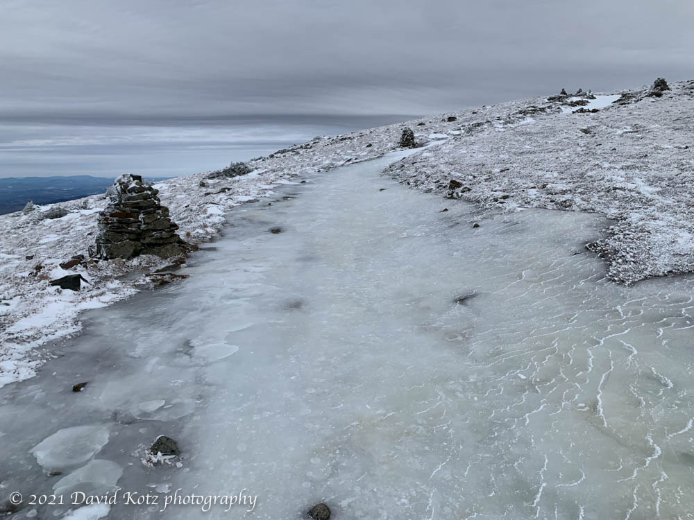 We made good time upward, stepping carefully on the thin layer of snow covering the icy trail. After about two miles it turned steeper and we paused to put on crampons. I was excited because I bought these crampons, used, from a neighbor about five years ago… but had yet to use them. Normally I find microspikes (from Hillsounds) to be suitable. Today, they would have been fine except for the final approach, on the summit cone. There, the rain had turned level sections of the trail into pools, which were now frozen solid and slick. Full crampons were clearly the footwear of choice.