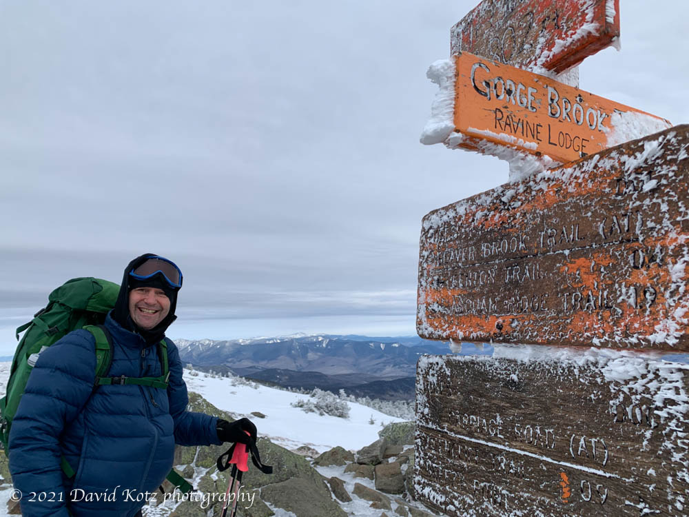 The trip had been calm, nearly windless so far… until we reached the summit; there, the cold wind blasted at our backs as we enjoyed the downwind view toward the east and north – toward the Franconia Range and Presidential Range. The blue skies had given way to a gray overcast, but the views were still spectacular.