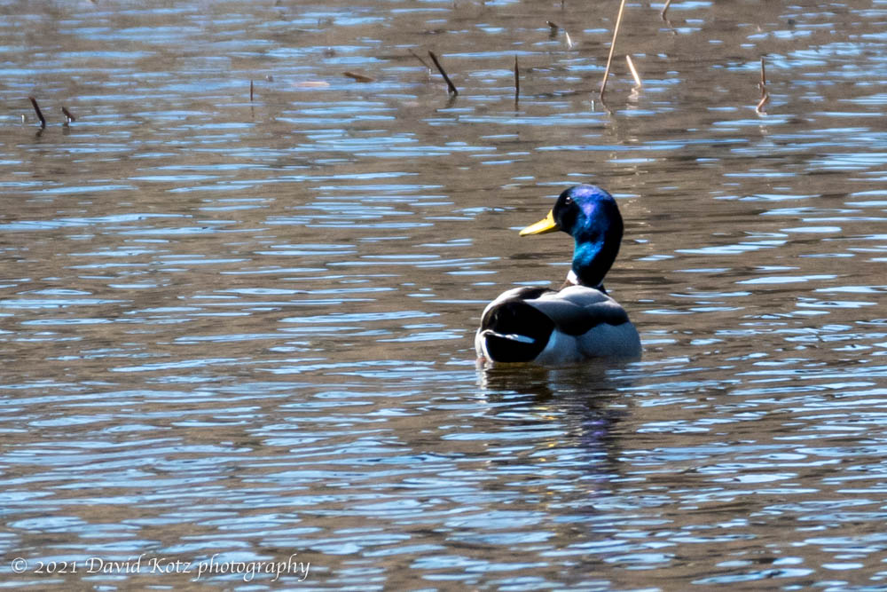 A stroll along River Road, just upstream, brought me an opportunity to see some of the local regulars as well as some unusual migrants – all at the mouth of Grant Brook. Although the winter’s ice has just begun to recede, the critters moved in quickly. We saw some green-headed Mallard ducks, but also a pair of Mallards with vibrant blue heads: