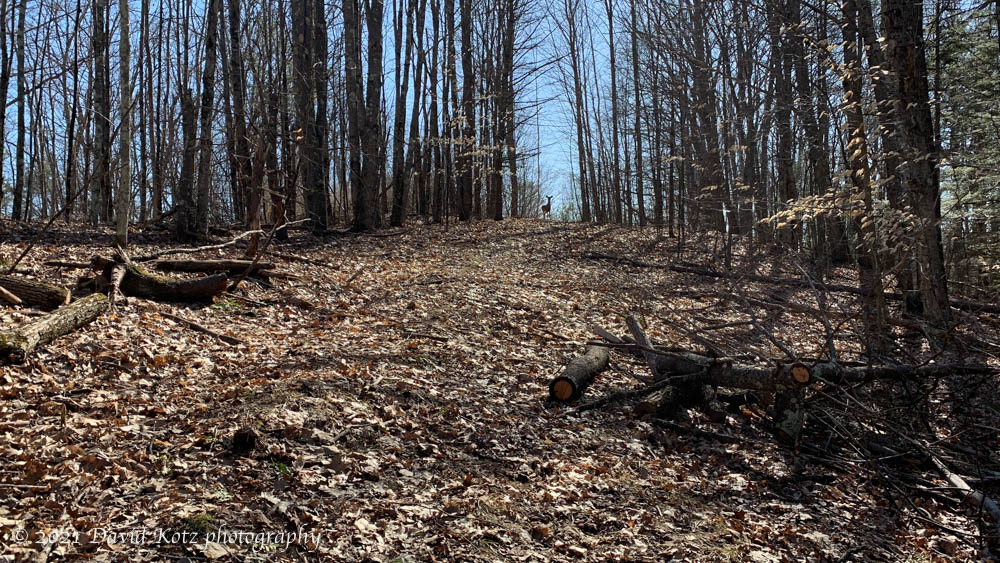 Yesterday afternoon I took another walk up the hill behind our home, to revisit the curious spot where a deer had met its end (discovered last week). As I climbed the hill, a family of wild turkeys slowly tried to sneak away – not easy now the snow has melted and the crisp, dry leaves of fall cover the forest floor. I noted they were heading uphill away from me, but toward the summit that I would soon reach by a looping path. As I neared the crest, two deer bounded away, flashing their white tails. One paused and turned, curious about me. I was able to approach much closer, allowing me time to capture photographs and video.