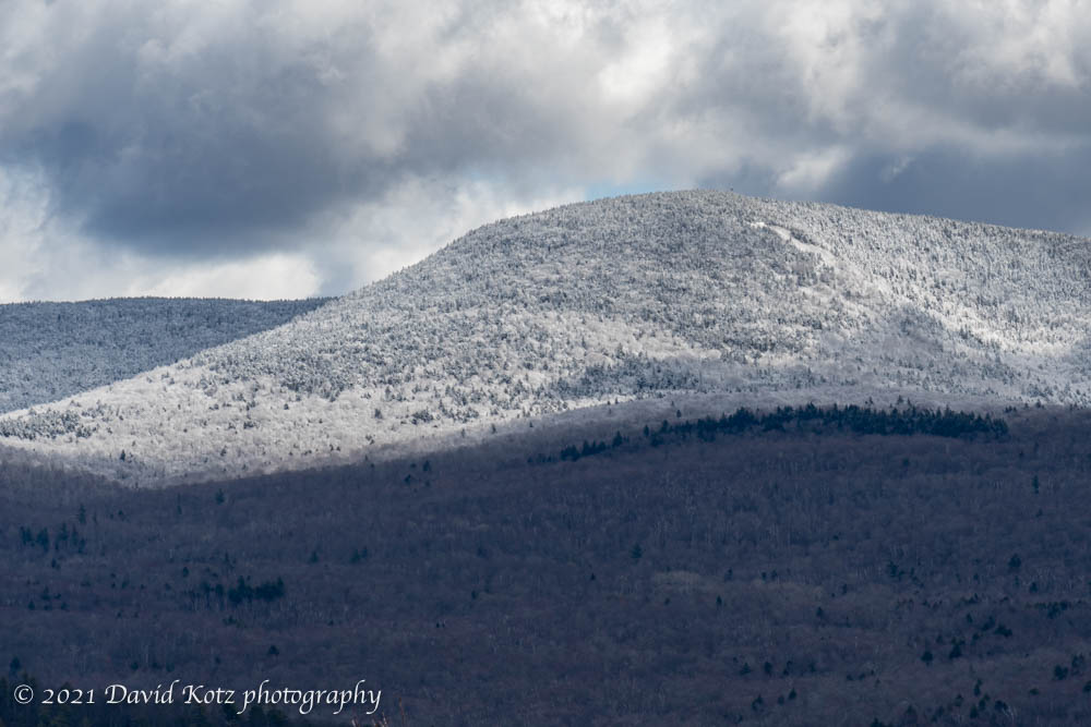 Early spring (late winter?) storms sometimes give one the opportunity to see the dramatic difference elevation makes. It rained yesterday afternoon, hard at times, for many hours. When I hiked up to the top of the Lyme Pinnacle this afternoon – it’s really just a grand hill, not really fair to call it a small mountain – I enjoyed the broad views into Vermont on the west and the hills of Lyme to the east. Most prominent, today, was the vast bulk of Smarts Mountain, with its level summit ridge and its fire tower rising above the trees – all coated in a fresh dusting of snow.