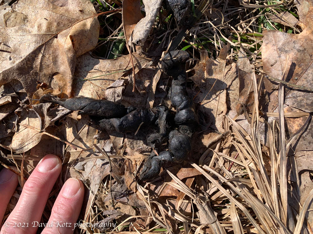 A few steps further along the path, I discovered fresh scat; after reviewing this site, I’d wager this specimen was left by a coyote. Clearly the coyote and the hunters have noted, as I have frequently, the popularity of this hillcrest among the local deer and turkeys.