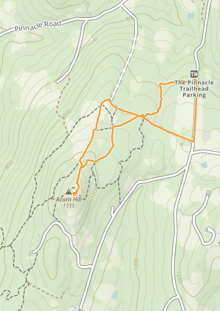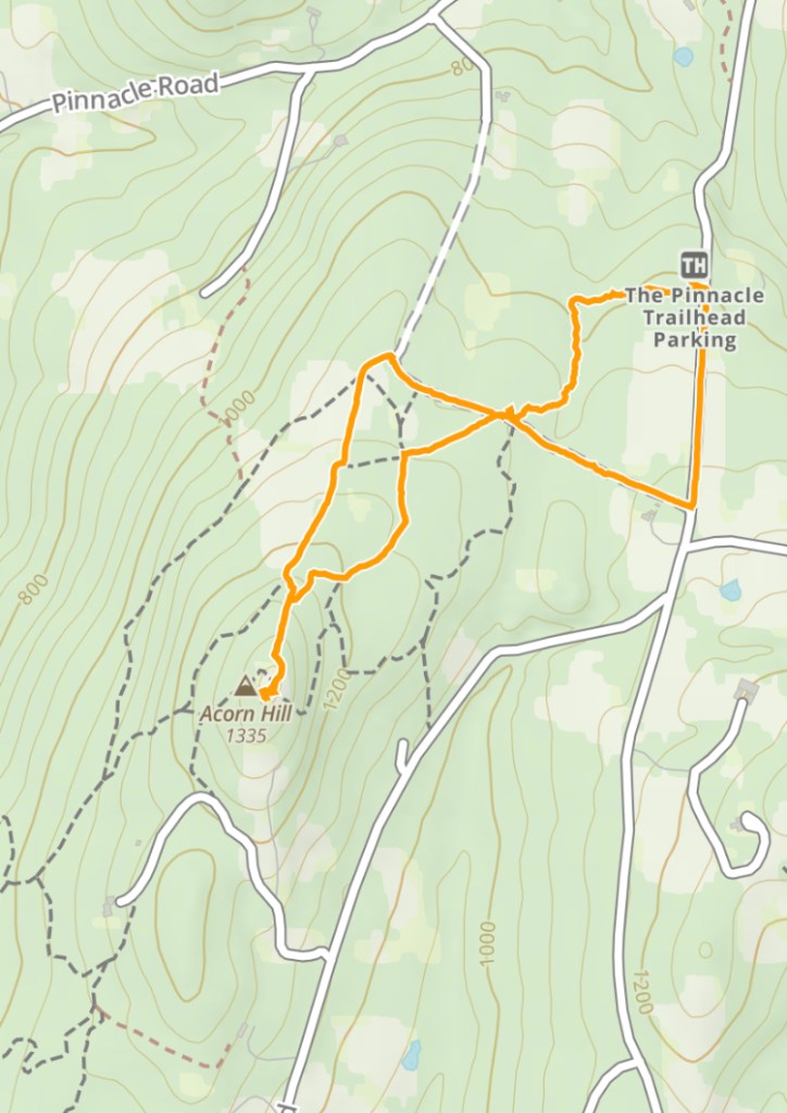 Full-res photos. Below is my figure-8 route, 4.2km, gain 100m. (The Pinnacle is also known as Acorn Hill.)