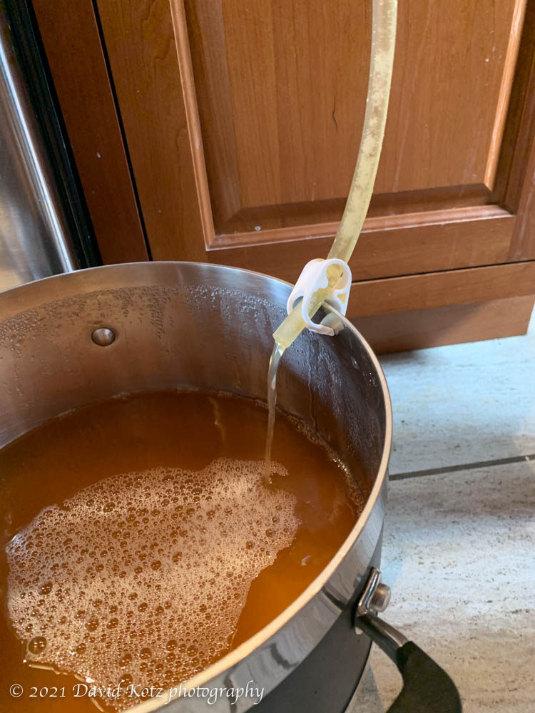In the pot already were 2 tablespoons of sugar, dissolved in a bit of water. After the beer was fully transferred, we stirred it all together, placed the pot on the counter, and set up the siphon again – this time, to siphon beer from the pot into the bottles. The result was five large bottles, each tightly capped.