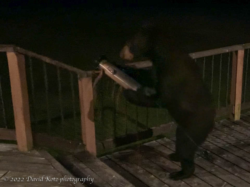 It was still rather dark, and although I could see well, the iPhone XR doesn’t quite have sufficient dynamic range. After the bear polished off one birdfeeder, and headed for the second, I turned on the outdoor lights. That didn’t faze the bear at all, but allowed me to capture the final four minutes of his visit on video. At the end, you can see our cat, watching intently, growling softly.