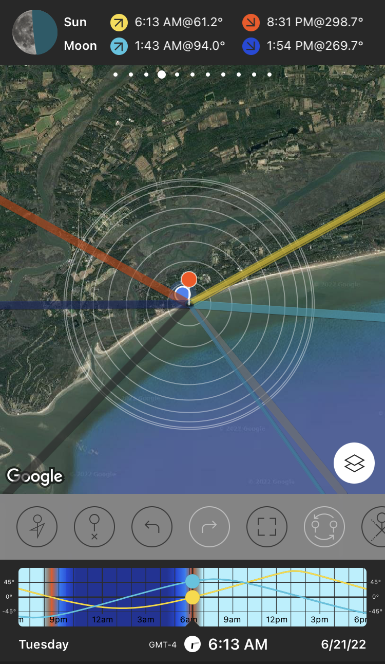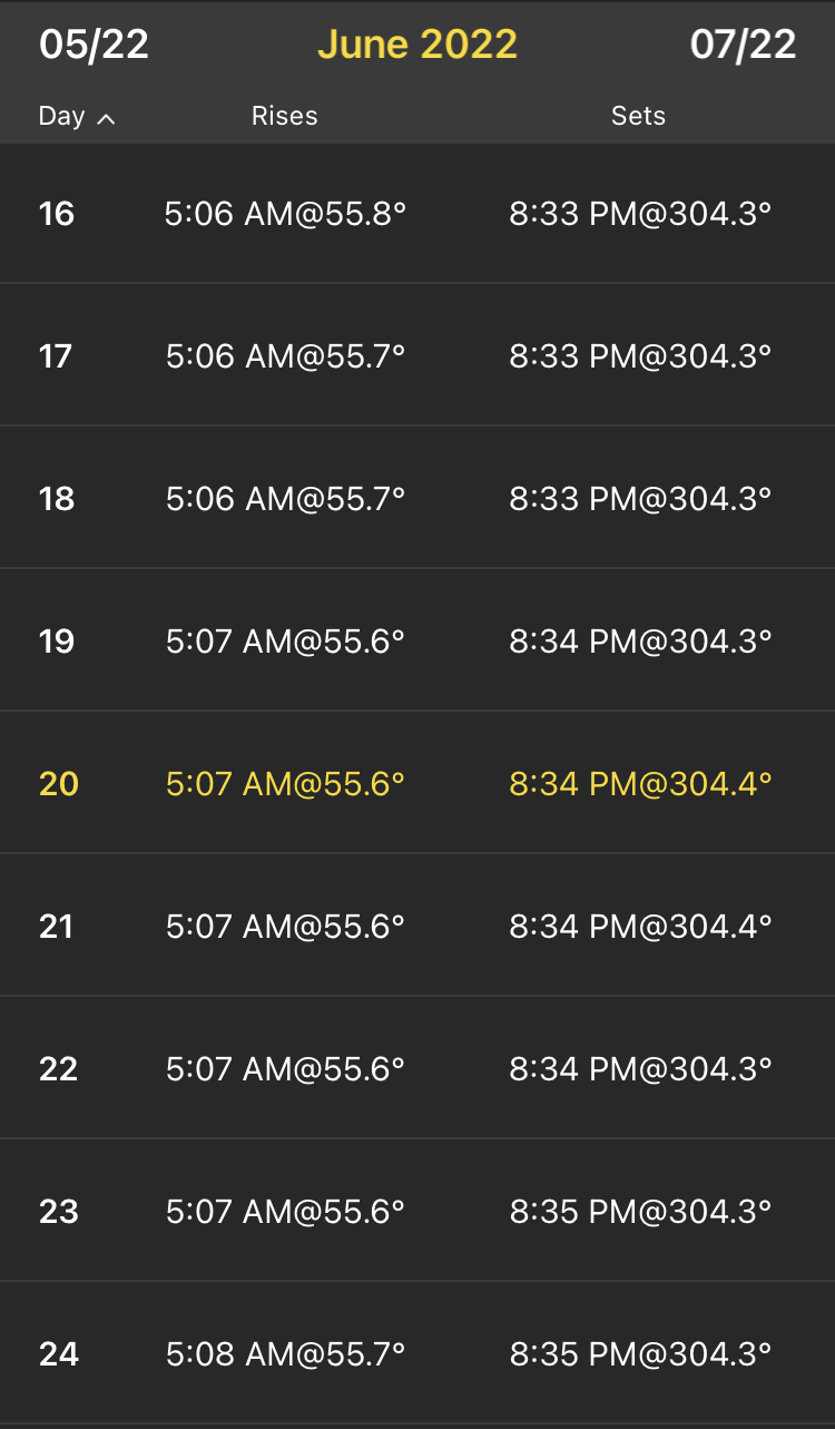 It’s often said that the summer solstice is the longest day of the year… but it’s not, at least according to the PhotoPills app, from which I grabbed all the screenshots here. This great app is designed for photographers who want to plan their photography around the cycles of the sun and the moon; it allows you to pick any point on earth and any date/time and map out exactly where the sun will rise and set, the moon will rise and set, and when. Anyway, at our New Hampshire house the solstice sun rises at 5:07am and sets at 8:34pm, for a day of length 15 hours and 27 minutes. The same times apply to the two days prior (June 19,20) and the day after (June 22)… but on June 23 the sun rises at 5:07am and sets at 8:35pm, for a day of length 15 hours and 28 minutes. (All times are rounded to the minute, which hide the details … so maybe today really is the longest day.)