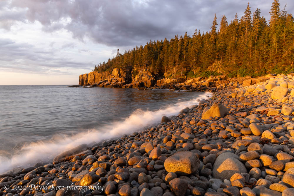 Acadia is well-known for sunrise and sunset views. Indeed, many people vie for reservations to drive up Cadillac Mountain for sunrise, purportedly one of the earliest sunrise views in the U.S. because of its elevation and far-eastern position in the timezone. But for the same reason, sunrise here is remarkably early: every day this week it has been between 4:50am and 4:57am, and that is later than it was on the summer solstice a few weeks ago. I am not interested in sunrise from the peak – indeed, I find it far more interesting to photograph scenery illuminated by the golden rays of the sun than to photograph the sun itself. After some reading, I learned that Boulder Beach, on the eastern shore, is a great location. It’s also only 10 minutes drive from my hotel in Bar Harbor.