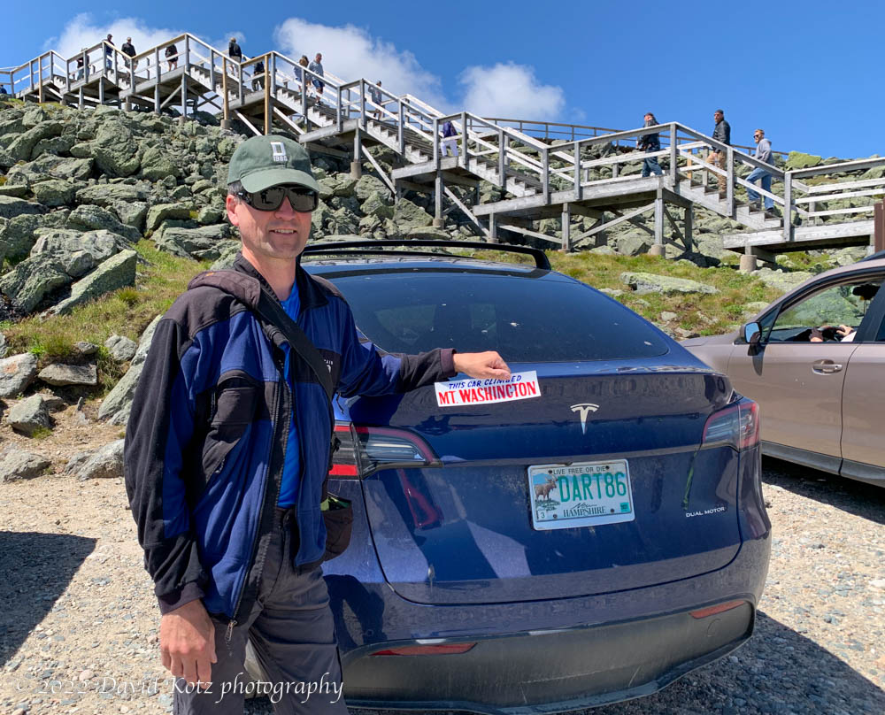 In my forty years of visiting and living in New Hampshire, I’d never driven up the Auto Road to the top of Mount Washington – though the “This Car Climbed Mount Washington” bumper stickers are ubiquitous. Today was a beautiful day, though, and Pam indicated she’d never been to the top of Mount Washington… so we went. As we passed through the toll gate we noted the Tesla Model Y battery was at 50%. We wound our way up the mountain, on extremely narrow roads with no guardrails and steep drop-offs on one side or another. The views were stupendous, but allowable only to the passenger! We reached the summit parking area with battery at 35%; it thus takes 15% of the battery to climb the mountain. But we earned most of it back! read on.